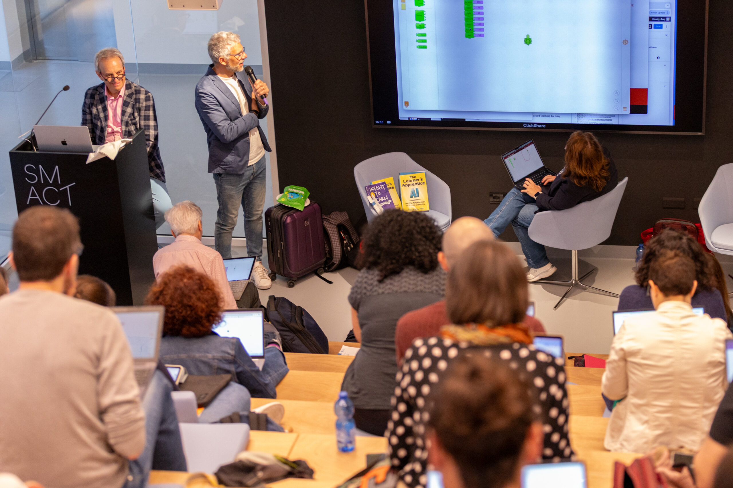 A seguire il seminario, un workshop pratico ha coinvolto una quarantina di docenti in un’esperienza diretta. Attraverso la fusione di coding e creatività, il laboratorio ha offerto spunti immediatamente applicabili nella pratica didattica quotidiana.